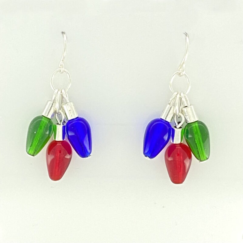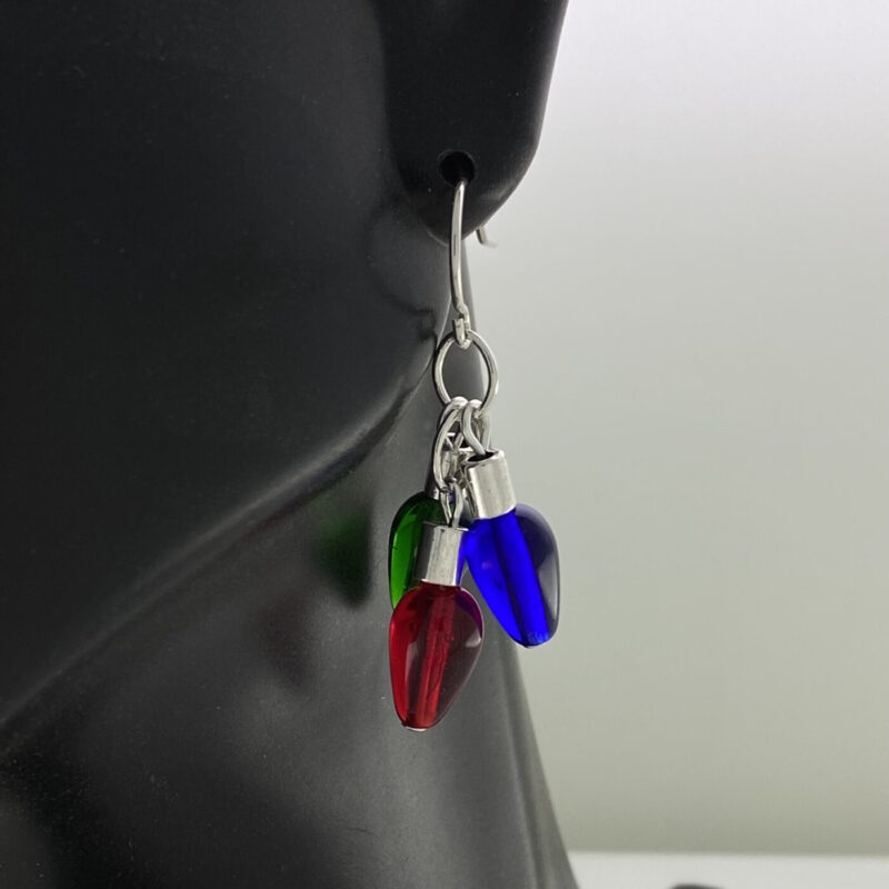 Created using red, blue and green glass teardrop beads hanging from a silver chain. The earring hangs from a surgical steel French ear wire. The earring measures approximately 26mm (1 inch) from the top of the ear wire.