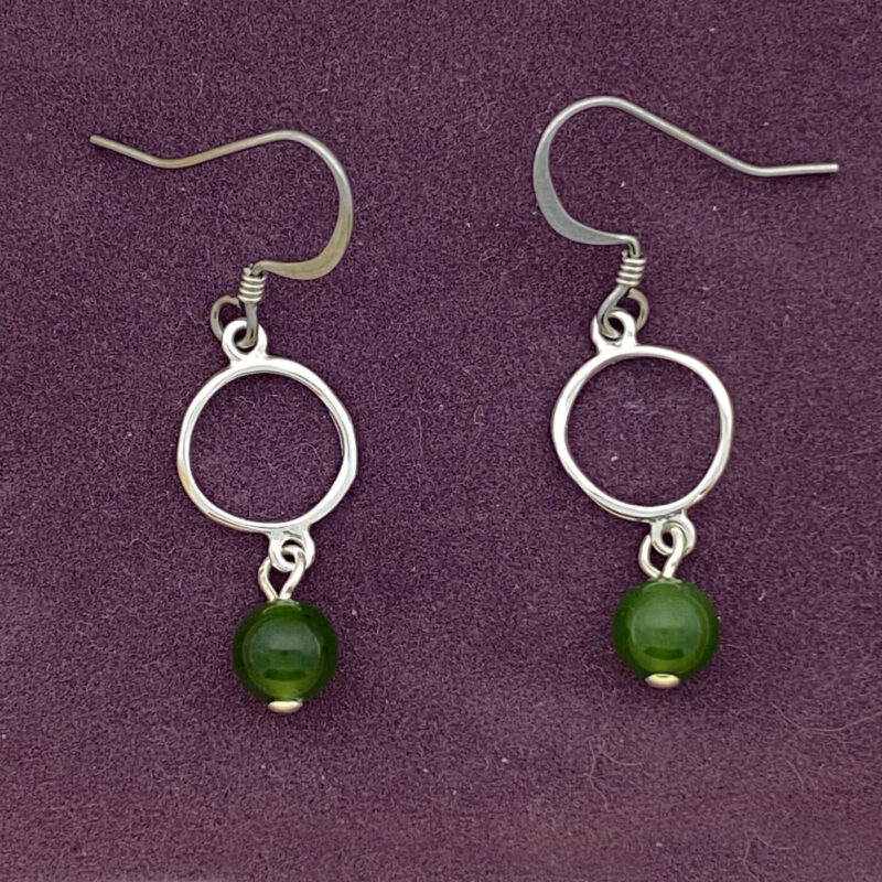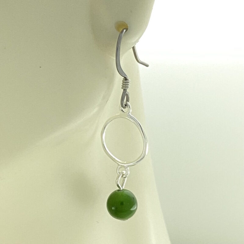 Created using a sterling silver connector and a 6mm green jade bead. The earring hangs from a surgical steel French ear wire. The earring measures approximately 22mm (7/8 inch) from the top of the ear wire.