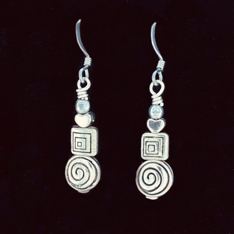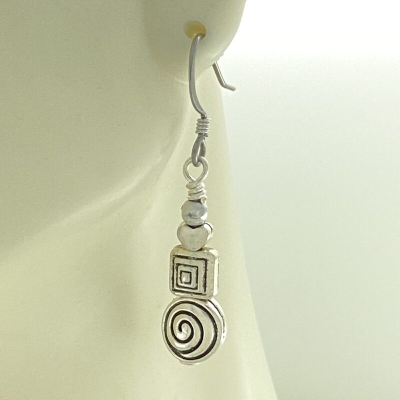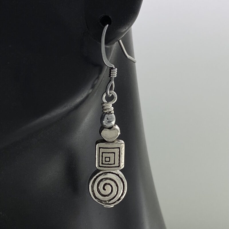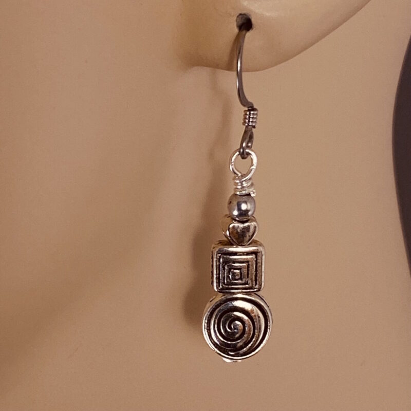 Created using a 3 silver beads with geometric designs. The earring hangs from a surgical steel French ear wire. The earring measures approximately 26mm (1 inch) from the top of the ear wire.