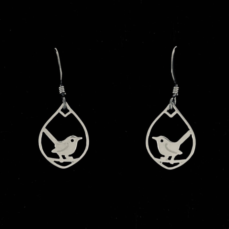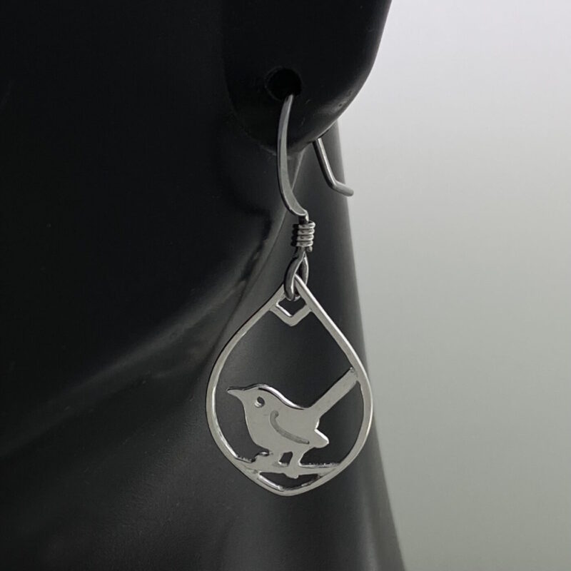 Created using a sterling silver wren charm. The earring hangs from a surgical steel French ear wire. The earring measures approximately 17mm (3/4 inch) from the top of the ear wire.